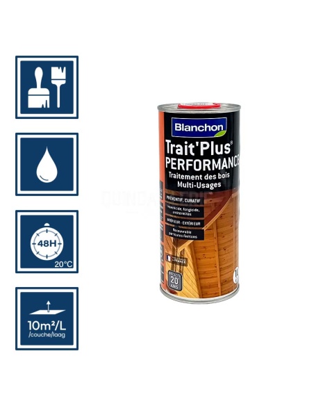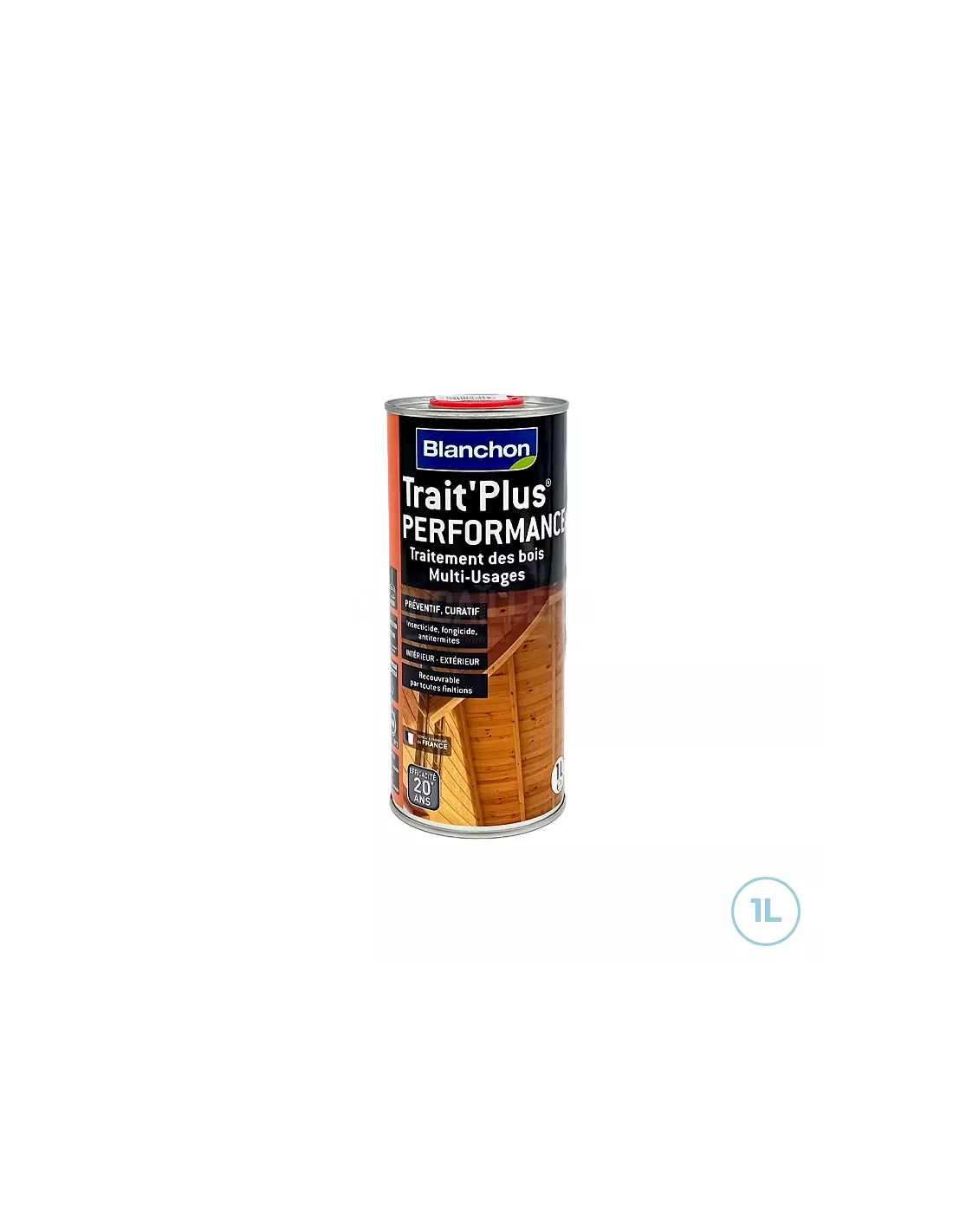 Le Trait’Plus Performance Blanchon est un traitement pour bois sous forme de microémulsion prête à l’emploi. Il pénètre en profondeur dans le bois grâce à sa haute efficacité, assurant une protection durable contre les agressions biologiques. Incolore et non gras, il est compatible avec toutes les finitions (peintures, lasures, vernis). Avec un rendement optimal de 10 m²/L sur bois intérieurs, il convient aussi bien aux bois résineux qu’aux feuillus.