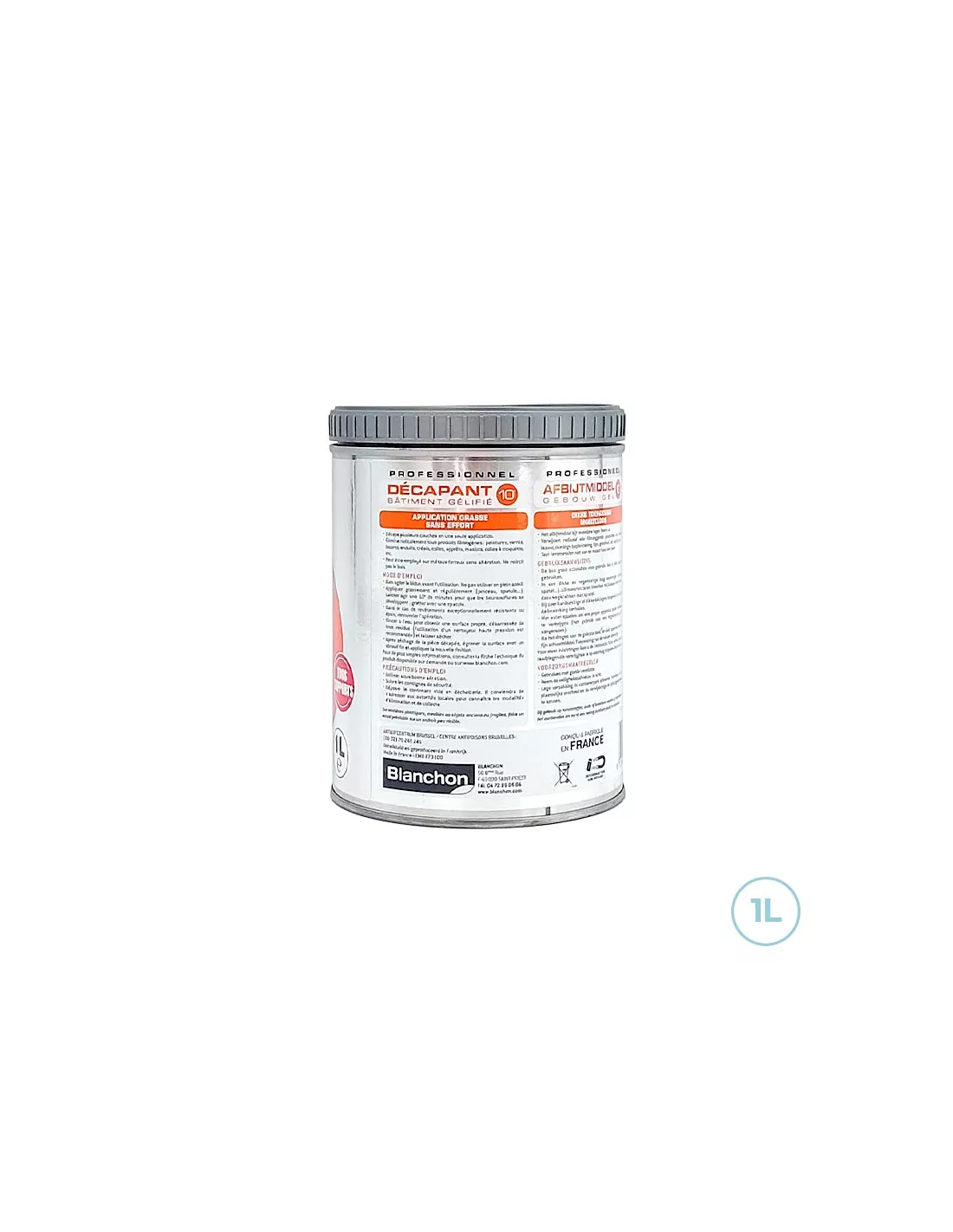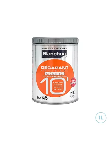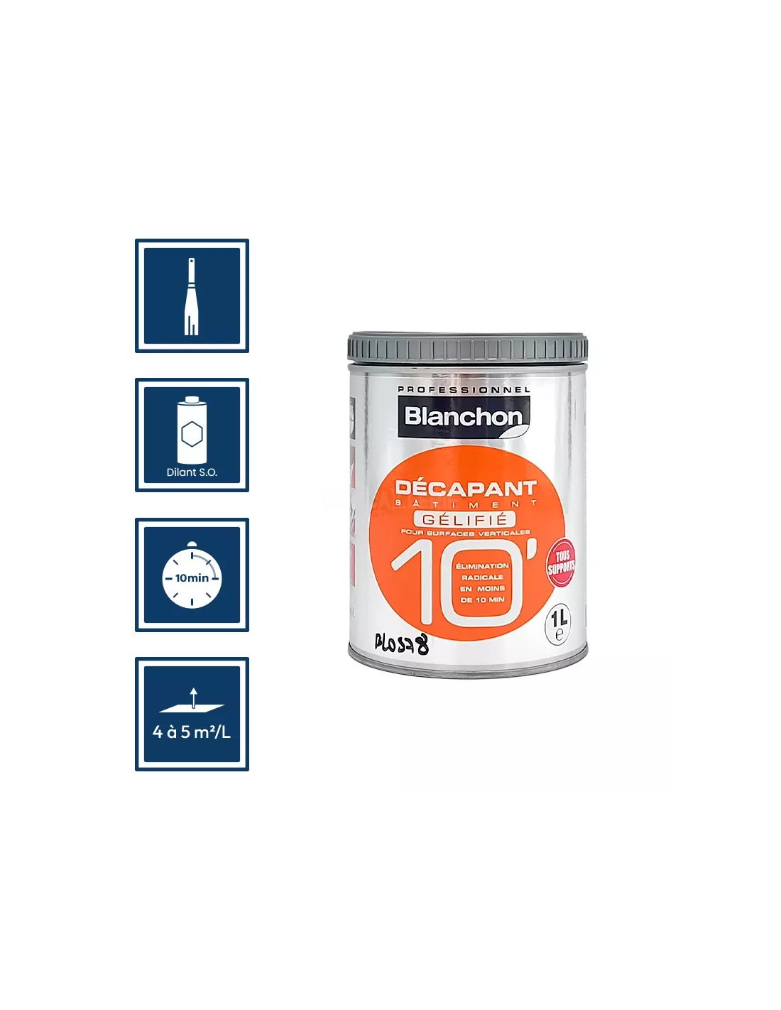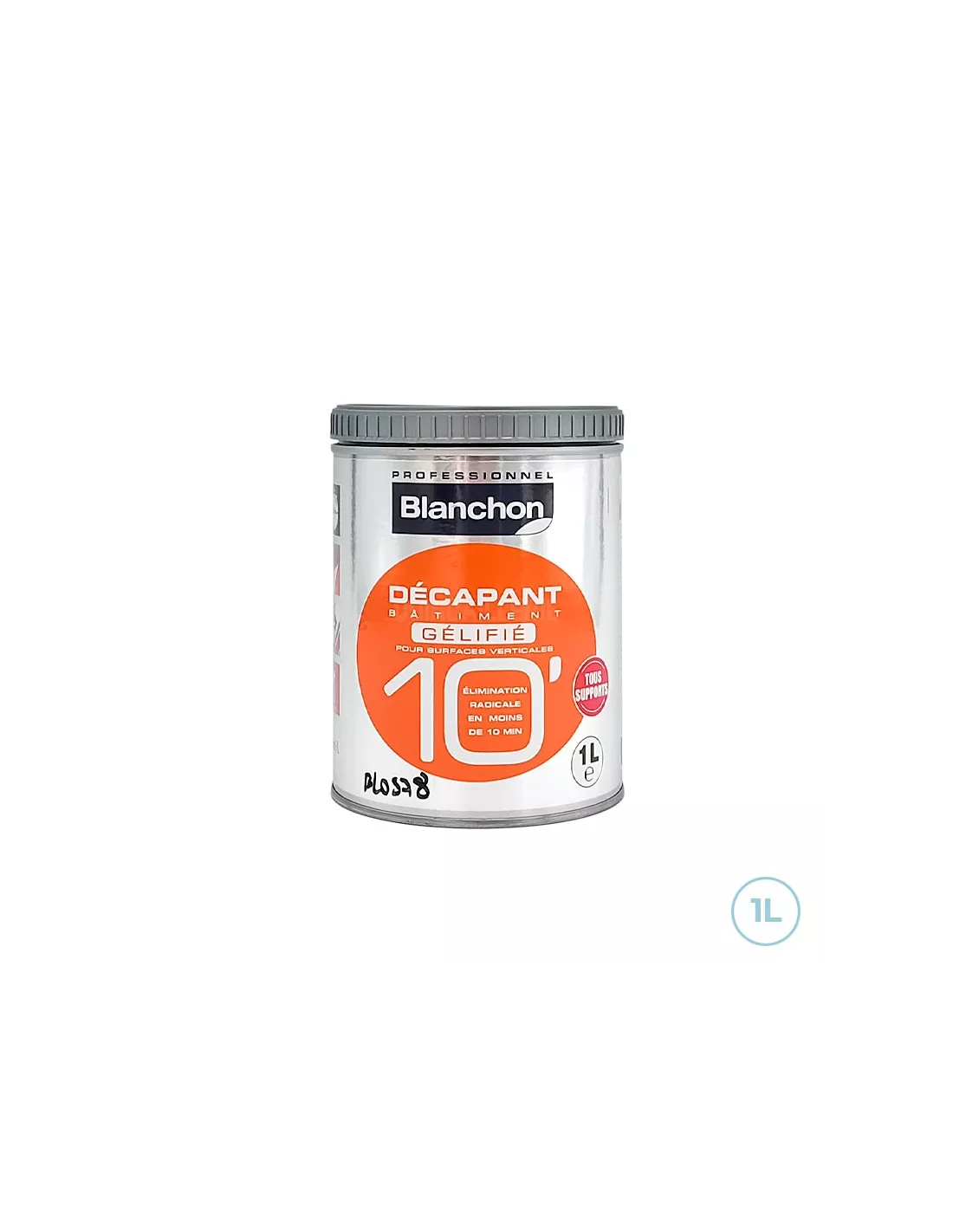Le décapant bâtiment 10 min gélifié 1 L Blanchon est un décapant multi‑supports à texture gélifiée, conçu pour une application sur bois, métal, verre, béton, carrelage ou plâtre. Il enlève en une seule application diverses finitions : peintures glycéros ou acryliques, vernis, lasures, colles ou crépis. Avec un rendement de 4 à 6 m² par litre, ce bidon de 1 L convient pour des zones moyennes à petites. Sa formule pH neutre respecte la surface sans noircissement ni corrosion du métal :contentReference[oaicite:1]{index=1}.