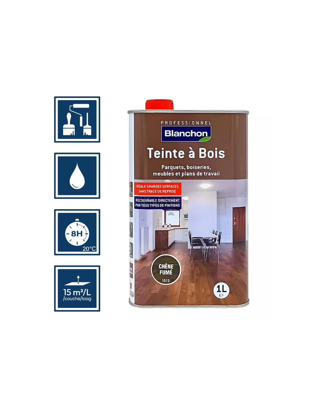 Composée de pigments riches et d’une résine aqua-polyuréthane en phase aqueuse, cette teinte à bois Blanchon est conçue pour un usage sur toutes les essences de bois, sauf rares exceptions. Sa formule prête à l’emploi garantit un rendu homogène sans trace de reprise, même sur les grandes surfaces. Un litre permet de traiter jusqu’à 15 m² selon le type de bois. Parfaite pour donner une teinte chêne fumé moderne et raffinée à vos planchers ou boiseries intérieures.